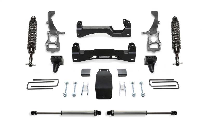 Fabtech's world-renowned IFS suspension design for the Ford F150 provides excellent drive ability both on and off road. There is zero bump steer throughout the suspension cycle that helps reduce driver fatigue while improving the overall drive ability of the vehicle. The near-stock track width keeps the tires under the fenders for a clean appearance. Fabtech's proprietary steering knuckle geometry provides an excellent lock to lock turning radius to maneuver in tight spots. Heavy-duty 1/4 in. thick steel crossmembers feature eccentric style alignment cams for easy adjustment. Triple front diff mounts reposition the differential for vibration-free operation at high speed. The stainless-steel Dirt Logic 2.5 Coil overs provide 6 in. of lift with an outstanding ride quality both on and off road. They are designed for aggressive off-road use yet have a supple on road feel. Rear Dirt Logic 2.25 shocks aid in damping the vehicle for a balanced ride. At the rear of the vehicle, the factory 2 in. block is replaced with a 5 in. Block and U-bolt system. Fabtech has addressed all aspects of the suspension for proper wheel travel and lock to lock steering without over cycling. For added confidence, this lift comes with a free 5-year 60,000-mile Powertrain Warranty.