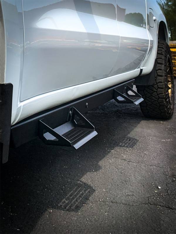 ICI Alumilite side steps are premium product featuring a main side bar and dual removable step hoops made from 3/16in 5052 aluminum, steel bolt-on rocker mount brackets, all triple stage e-coated and light texture powder coated for the most durable and rust-free finish. All hardware comes in a black zinc finish to match the steps. All Alumilite side steps include a limited lifetime structural warranty and a one-year warranty on defects of the powder coat finish. These side steps are designed to fit each application specifically and are not just a universal bar with vehicle specific mounting brackets, giving you the best fitting and cleanest looking step possible. Being made from aluminum they will not rust if you scratch them up on the trail, something no steel step can claim.