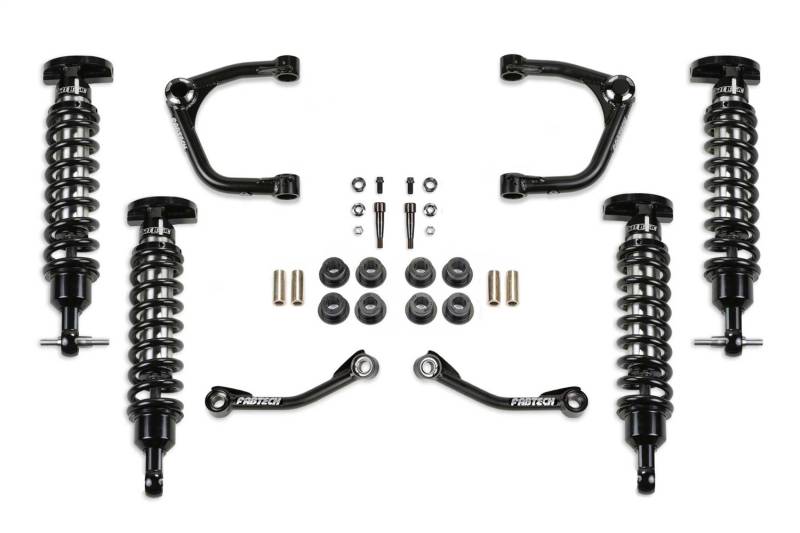 This high quality suspension has been designed to upgrade GM 1500 SUV's with standard suspension for increased strength and a balanced compliant ride for both on and offroad. The front suspension receives Fabtech's heavy duty Uniball Upper Control Arms and Dirt Logic 2.5 Coilover shocks. The Fabtech arms are vastly superior to the stock arms providing strength and longevity to the vehicle. They are constructed of 1.25 in. OD, .120 in. wall chromoly tubing with 1 in. FK Stainless PTFE lined Uniballs that attach to the factory GM steering knuckle without drilling. The replacement UCA's have been designed to work in conjunction with Fabtech's Stainless Steel Dirt Logic 2.5 Coilover shocks for a complete front suspension system upgrade. The Dirt Logic 2.5 Coilovers feature cold wound coil springs for a smooth ride with the ability to tackle aggressive offroad terrain. The rear receives extended length upper link arms to allow for increased travel without bind. The geometry of these links provides the proper alignment to the rear independent suspension with the new ride height. As with the front, the rear also receives stainless steel Dirt Logic 2.5 Coilover shocks for a superior ride quality. This 3 in. lift kit system is perfect for those that want increased suspension performance with a low lift height. A great choice for daily drivers that overland and hit the trails on weekends.
