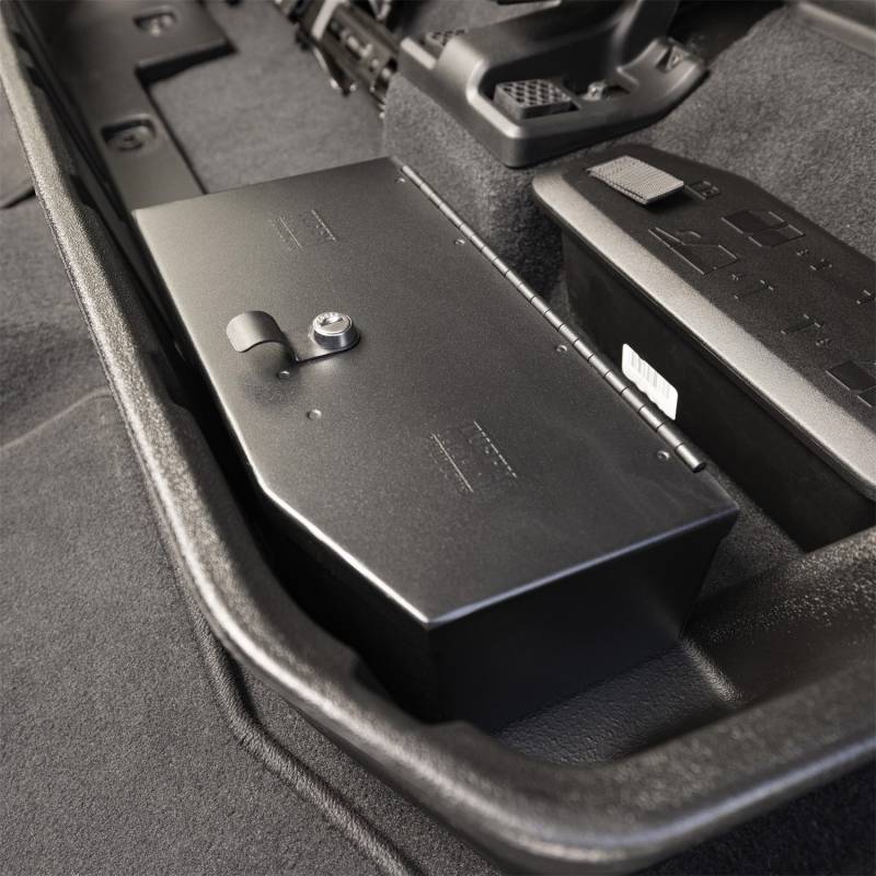 This high security welded steel lockbox mounts under the rear seat in your 2020-2024 Jeep Gladiator. The compact form of the Tuffy lockbox can be discreetly installed within the OEM plastic fence and has sufficient lockable storage to conceal valuables best left unseen to prying eyes. Its secured contents are easily accessed by flipping the driver's side rear seat up and opening the secured lid. Tuffy's Pry-Guard Locking System with a 10 tumbler double bitted security lock with built in weather seals will keep your valuables secure while you enjoy your adventures.