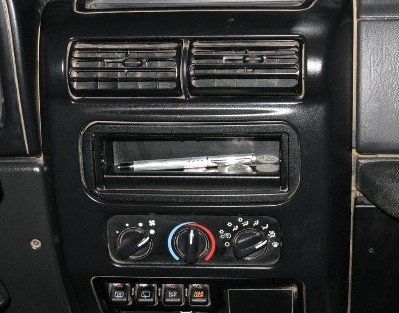 After pulling the stereo out to reinstall it in a secure Tuffy console, cover the leftover hole in the dash with a functional organization tray. Powder coated steel construction.