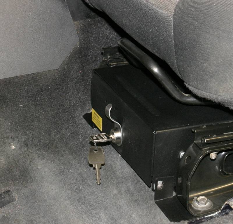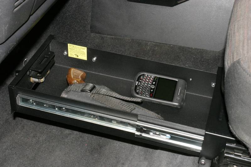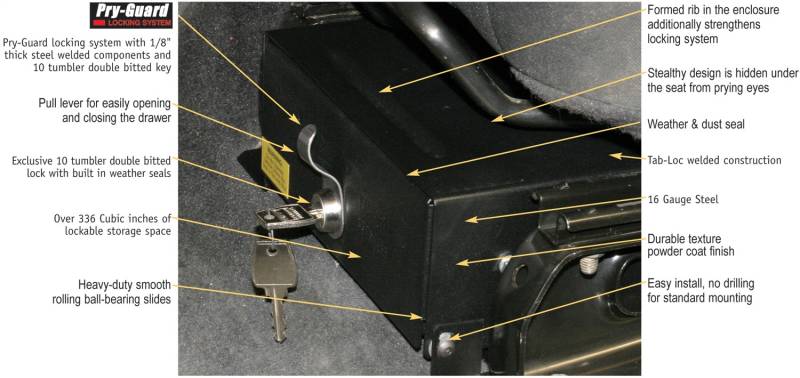 This high security 16 gauge steel security drawer mounts under the drivers side seat in a Jeep TJ and LJ (No flip seat). The formfitting design of the Tuffy lockbox has over 336 cubic inches of lockable storage. It's secured contents are easily accessed by maneuvering the drawer open and closed on the smooth ball bearing slides using the convenient pull lever. Featuring Tuffy's Pry-Guard Locking System with a 10 tumbler double bitted security lock with built in weather seals. The design incorporates a heavy duty fully extending slide system, weather seal and welded construction. A formed rib in the enclosure additionally strengthens the locking system. Mounts inconspicuously under the drivers side seat in a Jeep TJ (No Flip Seat) and LJ (No Flip Seat) out of apparent sight of would be thieves.