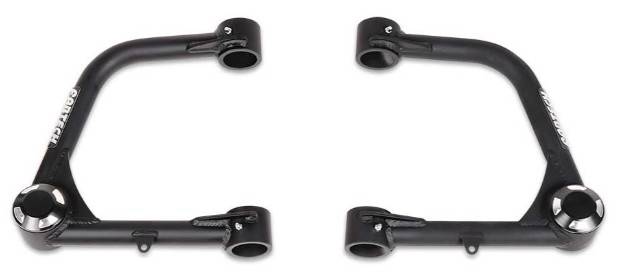 Fabtech's Uniball Upper Control Arms provide increased strength to the front suspension by replacing the stock ball joint upper arms that can become worn and eventually fail under aggressive offroad use. These heavy duty upper arms are designed for longevity in rugged offroad conditions. They also feature additional caster compared to stock upper arms for superior on road use with oversized tires. The top quality construction of these arms include .120 in. wall 1.50 in. OD 4130 Chromoly tubing and American made 1 in. FK Stainless PTFE lined Uniballs. The 17-4 Stainless Steel heat treated Uniball pins fit into the factory ball joint tapers without modification to the spindle for easy return to stock feature. Fabtech uses 17-4 Stainless steel for the misalignments that provide proper clearance of the 1 in. Uniballs throughout the travel range. On the frame side of the upper arms, there are quality urethane bushings that help reduce road noise while providing longevity. Fabtech's Uniball Upper Control Arms are an excellent upgrade to stock or lifted suspension systems for drivers that demand the best for their vehicle.