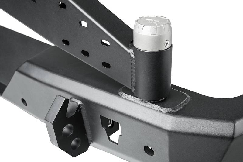 Make sure that your Jeep is as tough as any trail you're likely to tackle. Plastic bumpers might look good, but run into anything more than bug guts and you'll see why you need the strength of steel on your rig. That's why we recommend you keep the flimsy plastic in the picnic basket, not on your Jeep. Rugged Ridge HD Series Bumpers are trail-tested, proven designs that pack a serious punch. We designed the HD Rear Bumper to match the styling and functional features of both the HD Stubby and HD Full-Width front bumpers to round out an impressive off-road bumper package. Sturdy steel construction, dual-drilled recovery hooks and integrated hi-lift jacking points make the HD Rear Bumper a serious contender. And when you add the strength & stability of a Rugged Ridge Swing-Out tire carrier to the package, the HD Rear Bumper proves to be the best-built bumpers in their price class…or any class. (Works with OEM or Rugged Ridge trailer hitch)
