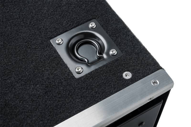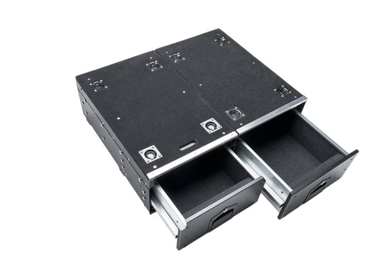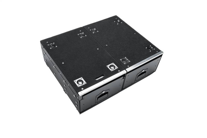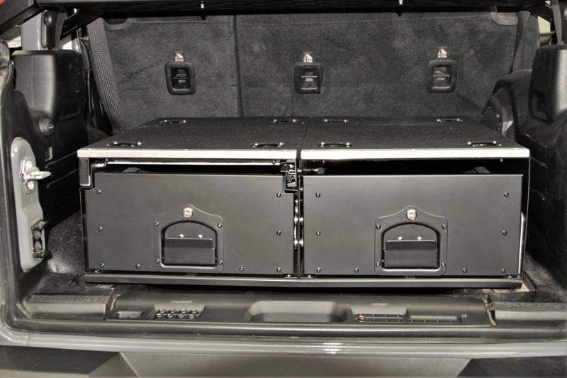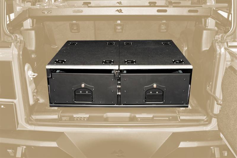 Tow straps, tool kits, spare parts and recovery gear…it's enough to turn your Jeep's cargo area into a trash pile. And forget about trying to find what you need when you need it. But it doesn't have to be that way anymore. The Rugged Ridge Cargo Storage Drawers are designed for Wrangler JKU / JLU to make quick and tidy work of the most cluttered of cargo areas. Its sturdy steel construction features two spacious drawers sliding on easy-glide rollers, and roomy enough to store all of your trail essentials. Each drawer is fitted with oversized paddle handle latches and are fully-lockable to protect your gear even when the top's down. On top, convenient recessed tie downs help you anchor larger cargo like coolers, tool boxes, and camping gear while a sliding work station extends out back to serve as a tabletop for a wide range of duties, from trailside repairs to tailgating. Bolt one in and get your Wrangler instantly organized!