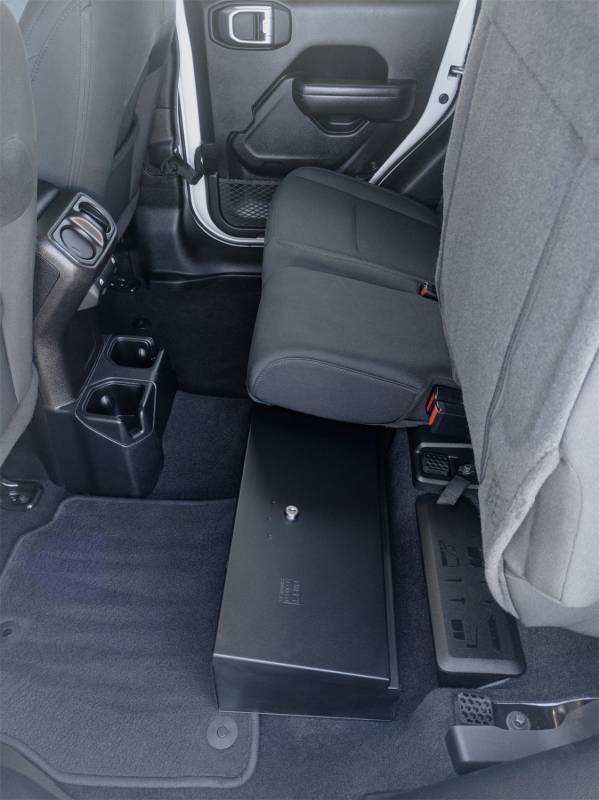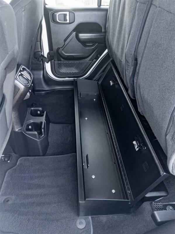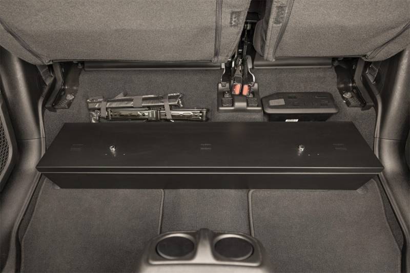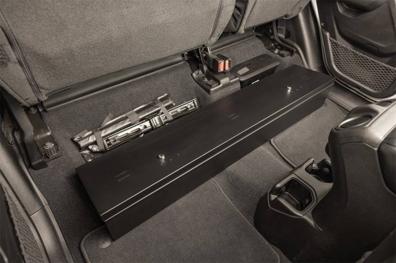 Looking to upgrade the under seat storage in your Jeep Gladiator? Look no further than the Tuffy high security, welded steel, under rear seat lock box. Easily mount it under the rear seat in your Jeep Gladiator using four included bolts and create over 2000 cubic inches of secure, concealed storage. The full width single lid design of the Tuffy lock box is easily accessed by flipping up the rear seats to access the secure lid. Use the full width to stow your gear, firearms or other long and valuable items. Featuring Tuffy's Pry-Guard Locking System with two 10 tumbler double bitted security locks that include built in weather seals. The entire lock box conceals neatly under the lowered rear bench seat. Secure some peace of mind and the best secure storage and organization on the market for your Jeep Gladiator.