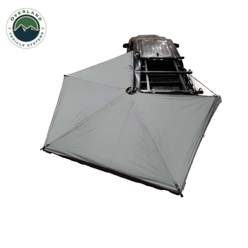 The Overland Vehicle Systems Nomadic 270LTE Awning is the perfect solution for anyone in need of reliable; free-standing shelter. Made with quality materials; this awning provides up to 75 square feet of coverage and can be used at a full 270 degrees. The Overland Vehicle Systems Nomadic 270LTE Awning is easy to set up; the Nomadic 270LTE Awning is supported by 4 integrated drop-down legs; 4 integrated 1""1/8"" tubular heavy-duty rafters supported on a Heavy-Duty Aluminum Frame. The Nomadic 270LTE Awning is made from 280G poly cotton rip stop material with heat sealed seams; easily folds; and secures in a 1000g PVC cover. This Nomadic 270LTE awning features a universal “L” mounting bracket solution that can be mounted onto a variety of roof racks; making it perfect for your off-road rig. The awning comes with a 4-year warranty; ensuring your satisfaction.