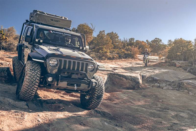 Transform your 2018-Present Wrangler JLU into the ultimate adventure pursuit vehicle with the Rugged Ridge Sherpa Roof Rack. It's the perfect addition to any truly capable rig, whether you need a stable platform to support a rooftop tent or you're hauling kayaks or camping gear for a weekend outdoors. Even if you just crave a little extra cargo capacity, the Sherpa Roof Rack is designed to deliver. Sturdy 50mm OD / 2.5mm-wall tubular steel construction, a tough, satin black powder coat finish, and two fixed crossbars make the Sherpa Roof Rack an essential upgrade for any overlander or outdoor enthusiast. The Sherpa Rack features dual cowl light mounting brackets to help you light the trail and a low profile design that allows full access to hard top Freedom Panels and flip-back soft tops for easy open-air enjoyment. Its dynamic load rated to haul 300 lbs. of cargo and, best of all, installation is a simple bolt-on affair with no drilling or cutting required.