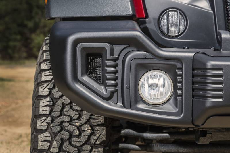 The Stamped Front Bumper from Rugged Ridge features a tough black powder-coated texture with a sturdy 11 gauge stamped steel construction. The stamping process used allows for the most advanced styling on the market, creating a bumper lighter than most aftermarket steel bumpers and is designed to work with all popular Winch models. Uses factory tow hooks.