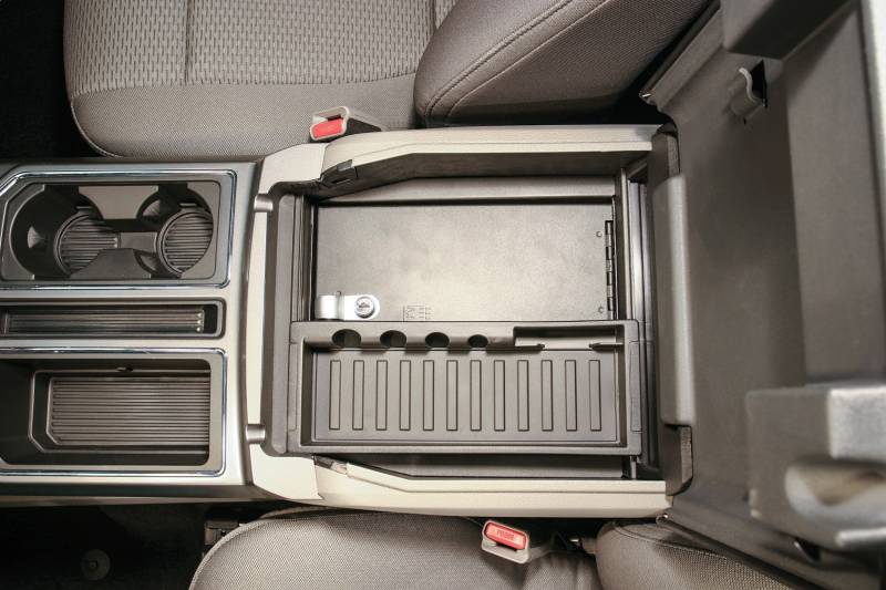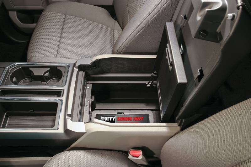Continuing the Tuffy legacy of designing and manufacturing the finest console safes in the industry since 1997, Tuffy is proud to introduce our new line-up of console safes for full size trucks beginning with the 2015 plus Ford F-Series flow-through center security console safe. It maintains a completely stock look including full use of the factory accessory tray, armrest and lid. Featuring a durable texture powder coat finish, the safe comes ready to install in just a few minutes without drilling.