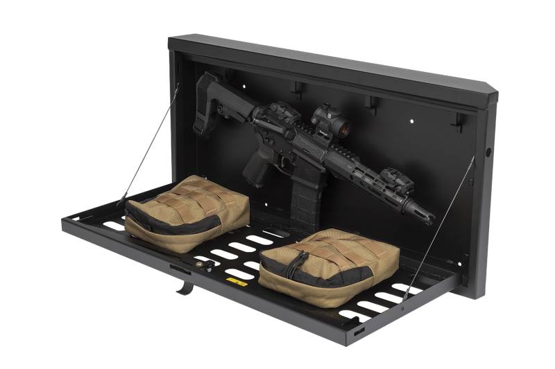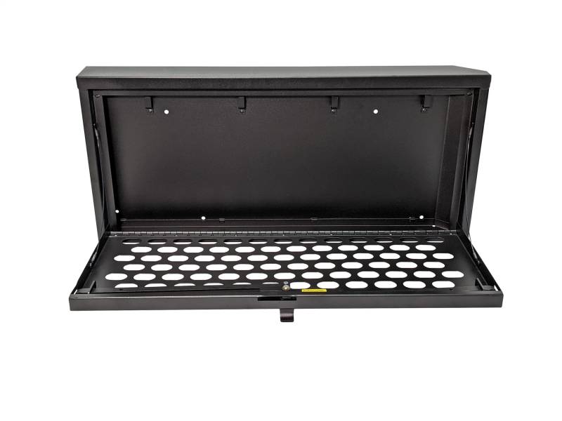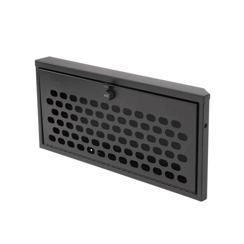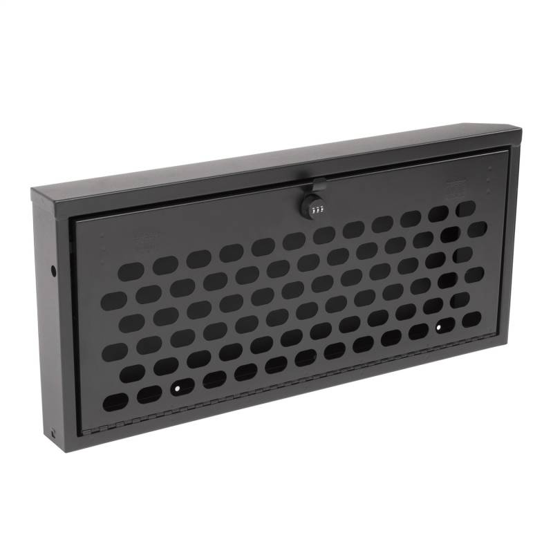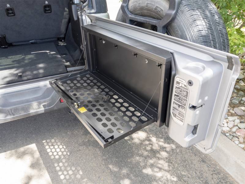 This heavy duty, high security lock box mounts on the inside of the Jeep JL tailgate providing ample secure storage for tools and other gear. The door folds down creating a work table for cooking or quick sorting and access of the lock box contents (Supports up to 40 lbs.). The entire Tuffy JL Tailgate Lock Box is constructed using welded steel, heavy duty fasteners and is covered with a durable textured powder coat finish. The JL Tailgate Lock Box installs to the JL Tailgate Rail mounts using standard hand tools with or without an OEM hardtop. Featuring Tuffy's Pry-Guard Locking System with a 10-tumbler double bitted security lock with built in weather seals. We engineered it to work seamlessly with the Tuffy JL Tailgate Enclosure to double down on your secure cargo storage options.