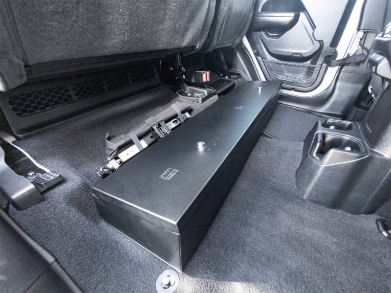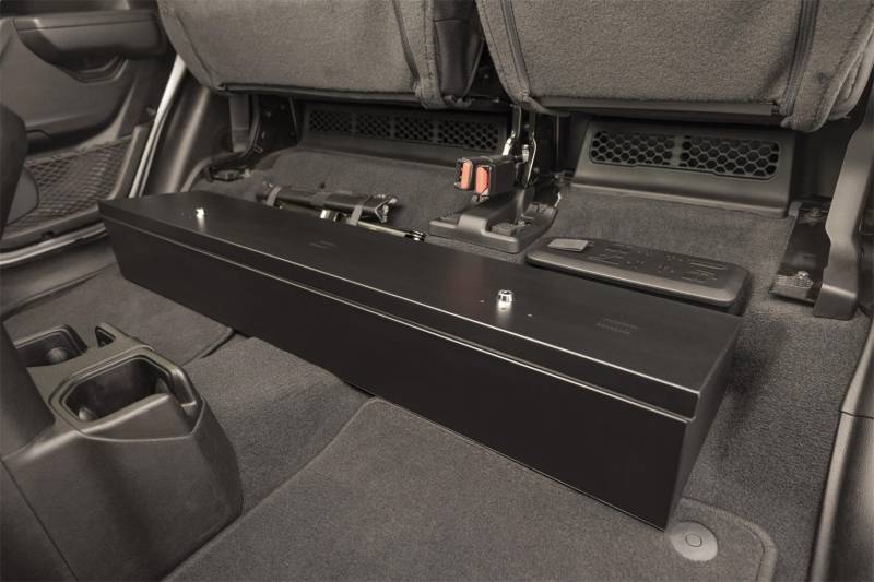 Looking to upgrade the under-seat storage in your Jeep Gladiator? Look no further than the Tuffy high security, welded steel, under rear seat lock box. Easily mount it under the rear seat in your Jeep Gladiator using four included bolts and create over 2000 cubic inches of secure, concealed storage. The full width single lid design of the Tuffy lock box is easily accessed by flipping up the rear seats to access the secure lid. Use the full width to stow your gear, firearms, or other long and valuable items. Featuring Tuffy's Pry-Guard Locking System with two three-digit combination security locks that include built in weather seals. The entire lock box conceals neatly under the lowered rear bench seat. Secure some peace of mind and the best secure storage and organization on the market for your Jeep Gladiator.