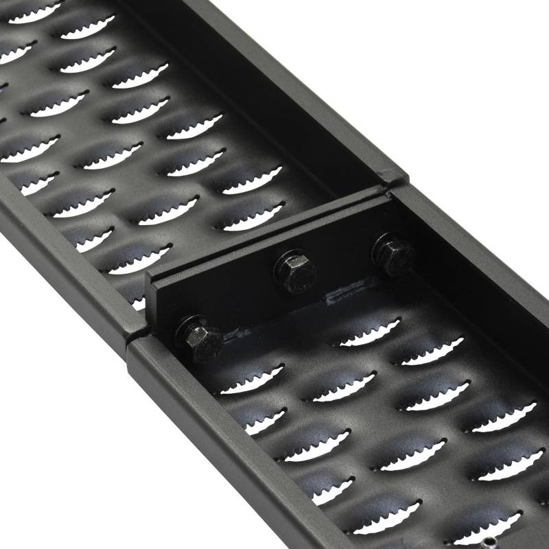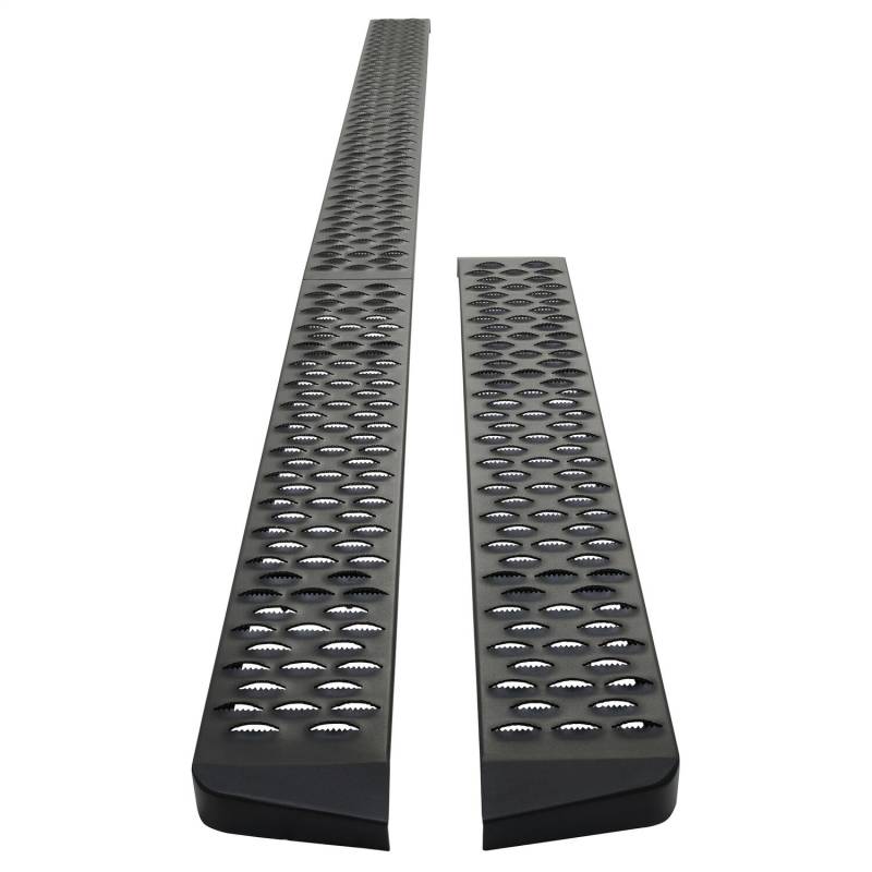 Westins Grate Steps Running Boards are engineered to provide maximum traction without sacrificing style. The 6 1/4in. step surface width features an aggressive 1/4in. high punched tread allowing traction in any weather condition. The unique serrated edges help clean dirt, snow and mud off your boots to keep truck cab clean. Grate Steps Running Boards feature stylishly formed and fully welded ends with a custom die-cast riveted logo badge. E-coated base coat provides long lasting corrosion protection which far surpasses that of the competition. Solid 1-piece construction makes the Grate Steps Running Boards ideal for construction, commercial, vans and utility use. Available in universal lengths (54in., 68in., 75in., 79in., 83in., 86in. and 90in.) with vehicle specific mount kit required, sold separately. Available in textured black finish.
