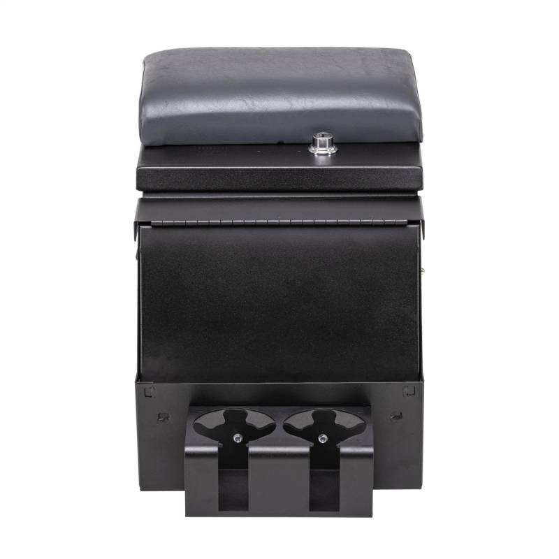 This convenient 12 1/2 inch wide, 16 gauge steel security console features Tuffy's patented pushbutton latch system. For safety and convenience while operating the vehicle, the lid also latches closed without having to be locked. It has 2 compartments, a separate compartment for mounting a stereo, CB Radio, or other electronic equipment, and a lockable rear storage space lined with a rubber floor mat. The spacious rear compartment accommodates a CD changer, tools, and other valuables.