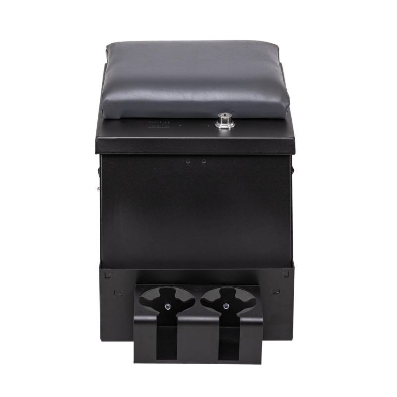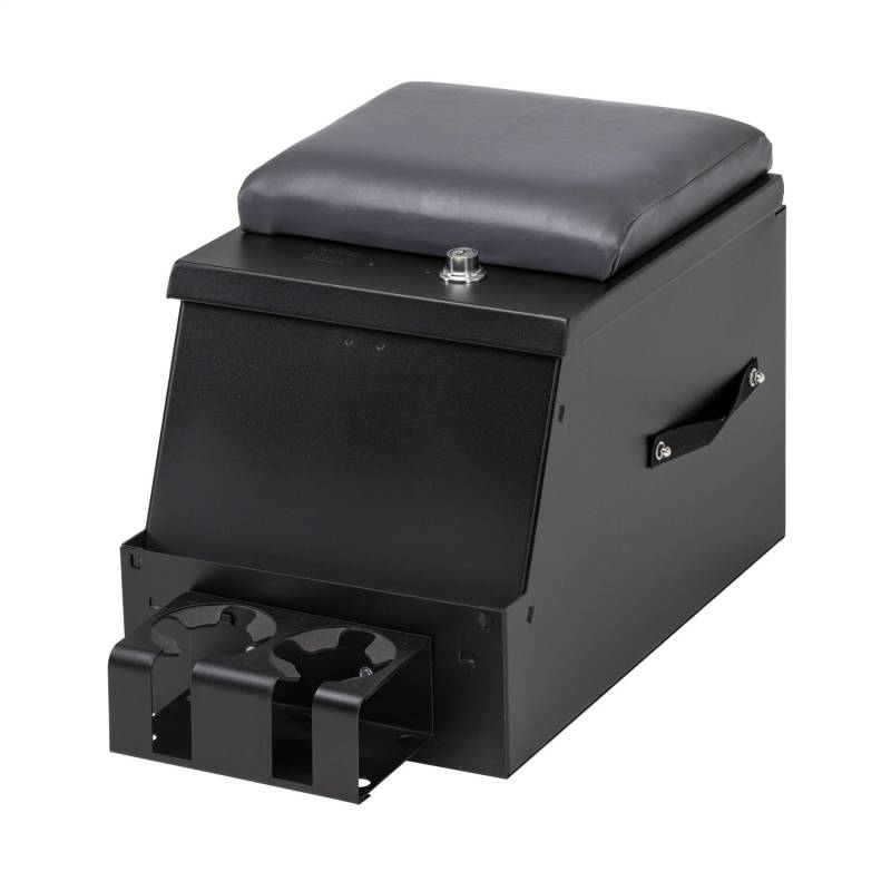 This high security 16 gauge steel console features Tuffy's patented pushbutton latch system. For safety and convenience while operating the vehicle, the lid also latches closed without having to be locked. It has a spacious compartment for mounting a CD changer, storing tools, electronic equipment, cellular phones, and other valuables. Rubber floor mat is included; other accessories are available.
