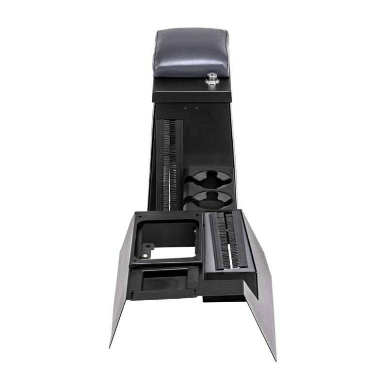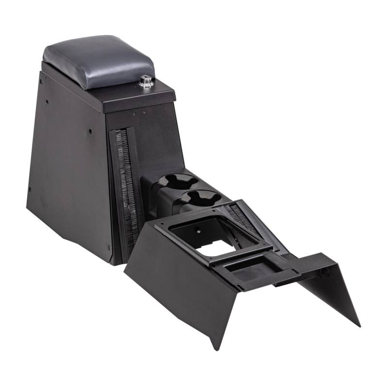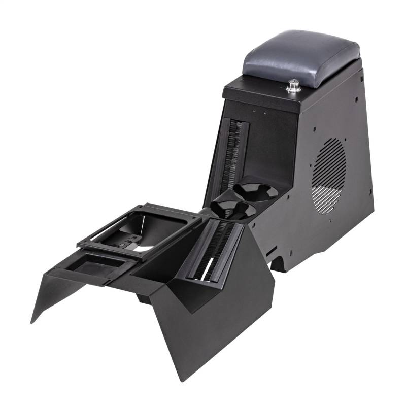 This high security 16 gauge steel console incorporates two oversized drink holders in place of a separate stereo compartment and will accommodate the factory sub-woofer or an aftermarket 8 inch speaker. The front and rear drink holders, padded armrest, and front console for levers are included in this model. The new sleek, custom fit design matches the TJ's refined interior while offering 2 1/2 times more storage than the factory model.