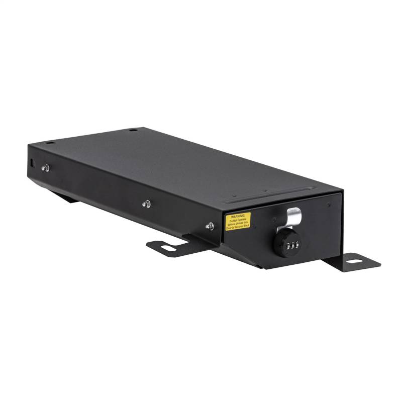 This high security 16 gauge steel security drawer mounts under the drivers side seat in a Jeep JK. The formfitting design of the Tuffy lockbox has over 324 cubic inches of lockable storage. It's secured contents are easily accessed by maneuvering the drawer open and closed on the smooth ball bearing slides using the convenient pull lever. Featuring Tuffy's Pry-Guard Locking System with a 10 tumbler double bitted security lock with built in weather seals. The design incorporates a heavy duty fully extending slide system, weather seal & welded construction. A formed rib in the enclosure additionally strengthens the locking system. Mounts inconspicuously under the drivers side seat in a Jeep JK out of apparent sight of would-be thieves.