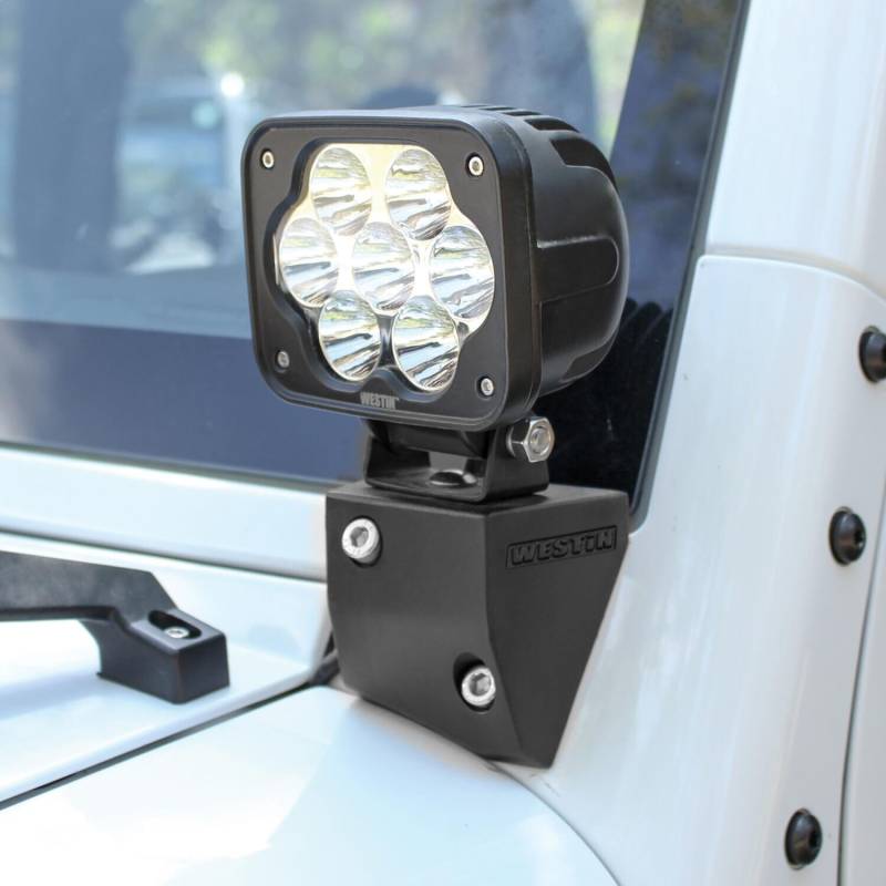 Westin Snyper Lower Pillar Light Mount offers Jeep(R) enthusiasts an ideal LED Light Mounting method. They are made of heavy duty cast aluminum and are a chiseled block style design. They feature exposed fasteners and have a textured black finish. They mount directly to existing points at the lower pillar location and are easy to install with no drilling required. Sold in a set that includes foam gaskets to protect the vehicle from damage.