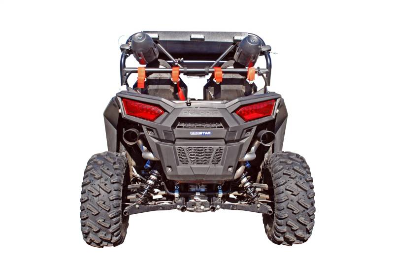 Compliment your Polaris Ranger RZR 900S with Gibson Twin Rear Exit Exhaust. Get an extra increase of 2-4 rear wheel horsepower, 3-5 more foot pounds of torque. With Gibson non-packed mufflers you can guarantee a consistent level of sound and performance quality for the duration of your vehicles lifetime. Utilizing a compression spring fitting allows plenty of movement to handle all types of abuse eliminating the possibilities of breakage, Finished with a set of T-304 polished stainless intercooled tips. All necessary hardware is included for a complete hassle free bolt on installation. Tested with a decibel reading of 96 dbs per the SAEJ 1287 testing procedure. USFS Approved Spark Arrestor