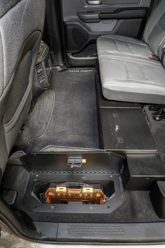 Sometimes you temporarily need to store your firearm in your truck, these heavy-duty locking Storage Lids replace the existing plastic OEM factory covers, creating secure storage in the hidden OEM compartments in the floor. The unique designs feature our Pry-Guard locking system with 1/8 inch thick steel components and a welded continuous steel hinge. The lids also provide a sturdier and more durable deck surface for items placed on top. Easy to install using standard hand tools in just a few minutes. Constructed from 16 gauge and 1/8 inch thick welded steel.