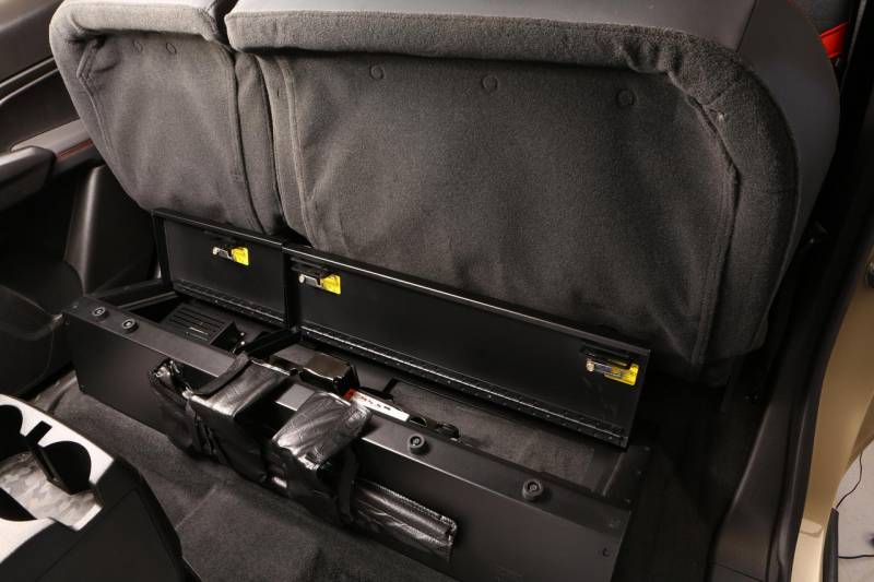 Crafted from 1/8-inch thick welded steel and finished in a durable textured powder coat, this American-engineered lockbox is built tough to stand up to life on the job, in the field, or on the road. It installs quickly with no drilling required and uses your truck's OEM hardware for a seamless fit under the rear bench. Dual lids open independently when you flip up one or both rear seats—making it easy to access tools, firearms, or anything valuable you want to keep protected and out of sight. Featuring Tuffy's Pry-Guard Locking System with three-digit combination security locks with built in weather seals to keep valuables safe, while weather-resistant seals help keep the elements at bay.