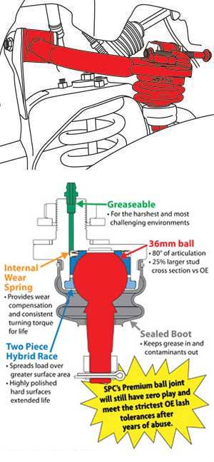 Get more droop travel: SPC’s arm has improved clearance to get around the spring bucket. With 80° of articulation in the upgraded ball joint and free pivoting bushings, SPC's arm gives you maximum droop travel.