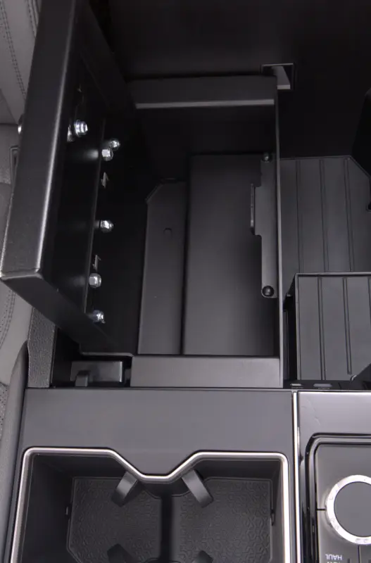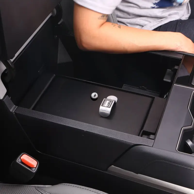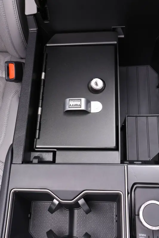 Lock down your essentials with factory-fit confidence. The Tuffy center console safe for Toyota Tundra converts your OEM console into hidden, lockable storage without sacrificing everyday convenience. Built from heavy-duty welded steel and finished with a durable powder coat, it blends seamlessly with your interior while delivering serious protection for wallets, keys, firearms, tablets, and more. With over 900 cubic inches of secure capacity, this safe makes your Tundra's console work harder, keeping valuables out of sight and locked under steel. Installation is quick, clean, and drill-free—fastening directly to factory mounting points while maintaining full use of your stock armrest, lid, and accessory tray. The high-security keyed lock provides reliable access while resisting pry attempts with Tuffy's proven strength. Designed specifically for the Toyota Tundra, this console safe delivers the OEM fit and finish you expect, with the everyday security you demand.