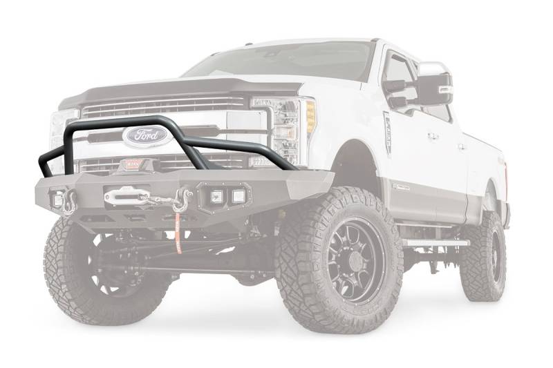 The Baja Grille guard (push bar) bolts onto a Warn Ascent front bumper for style and functionality.'