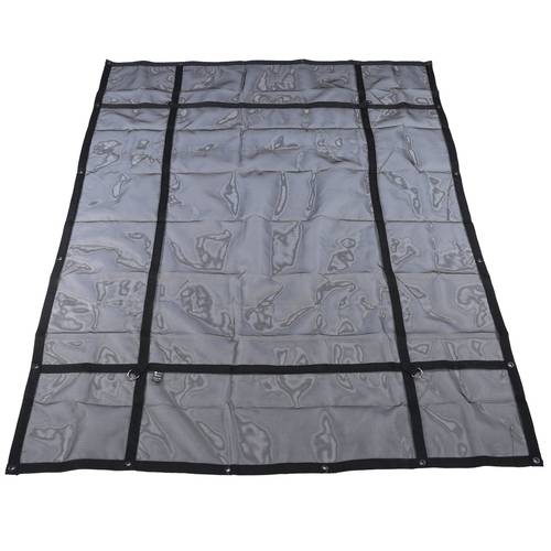 Heavy-duty mesh material for containing light weight cargo. Prevents debris from blowing out. Webbing edging for strength. Grommets and rings for strong tie down points.