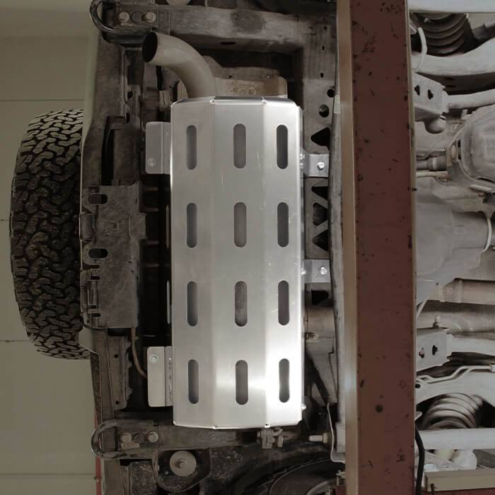 The Ford Bronco Exhaust Skid Plate is built from high-quality laser-cut 1/4" (6 mm) aluminum, offering strong yet lightweight protection for the exhaust system and rear arm. Specifically designed to fit the Bronco’s structure, it ensures minimal clearance loss while withstanding off-road impacts. Recommended as part of Asfir’s full underbody protection kit.