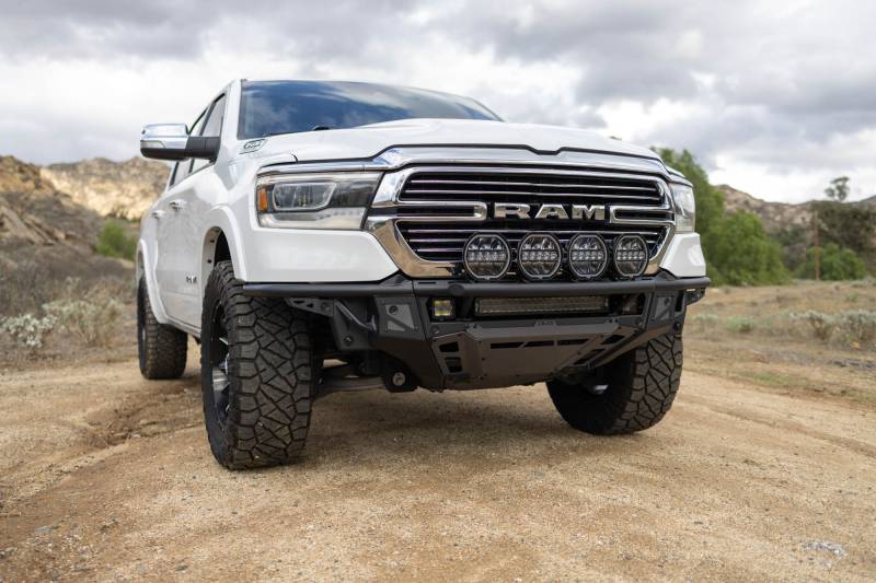 2019-2025 Ram 1500 Tube Front Bumper designed for high-clearance off-road use. Center section fits a 20" dual-row light bar with (2) 3" pods or (6) 3" pods. Wings hold (2) 3" pods per side. Optional prerunner-style push bar mounts a 20" light bar, (4) 7" rounds, or (8) 3" pods. Includes full skid plate for added protection. Retains factory parking sensors. Features welded zip-tie tabs for wire management, micro-texture black powder coat, and speckled steel gray accent panels. Bolt-on installation.