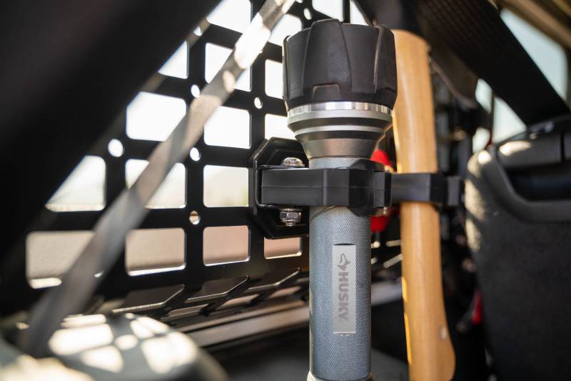 Our Quick Release Tool Mounts offer unlimited solutions for storing tools and equipment on your interior or exterior molle panels. They can be used individually for securing flashlights, recovery gear, tool bags, air inflator/deflator equipment, and other gear; or you can pair them up for mounting long handled tools such as shovels or axes. The mounts feature a quick release for easy access to your equipment. The clamp radius is adjustable from 1 ¼ inches to 1 ⅝ inches for storing various sized accessories, and it rotates at the base for versatile mounting angles.