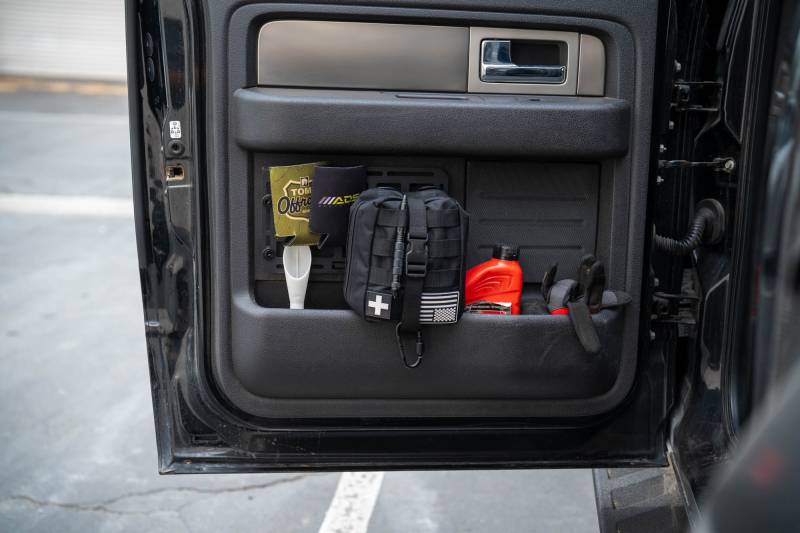 Strong 3mm steel molle panels with 1.5" x 1" cut-outs and extra 1/4" mounting holes for versatile gear storage. Includes spacers for offset mounting. Great for tools, recovery gear, and accessories in vehicles, garages, or workspaces. Micro-texture black powder coat finish. Drilling required. Available in 15” x 12”, 27” x 12”, and 23” x 15”.