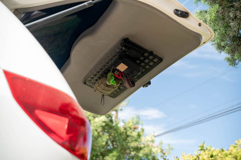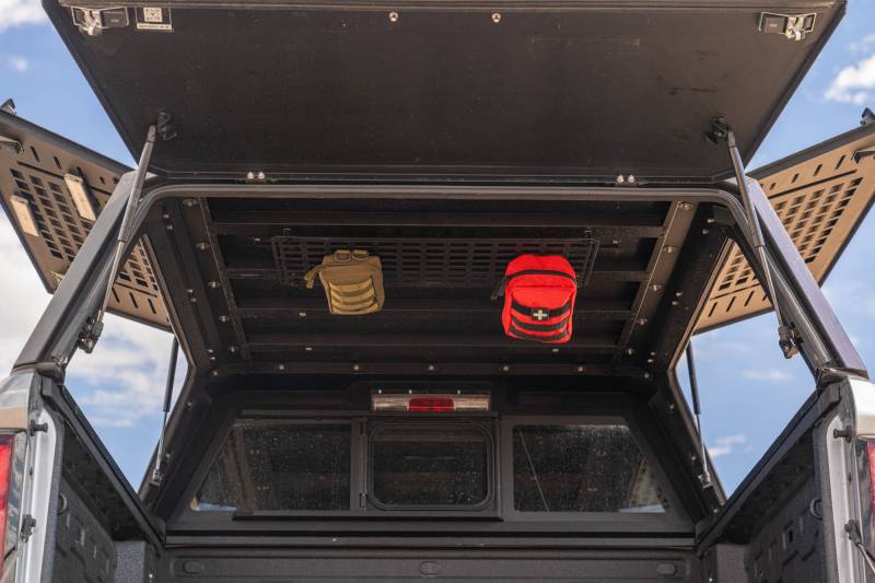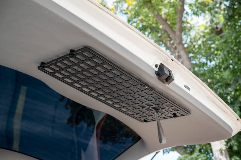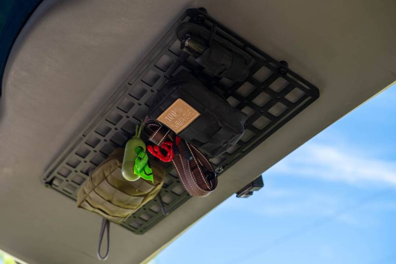 Strong 3mm steel molle panels with 1.5" x 1" cut-outs and extra 1/4" mounting holes for versatile gear storage. Includes spacers for offset mounting. Great for tools, recovery gear, and accessories in vehicles, garages, or workspaces. Micro-texture black powder coat finish. Drilling required. Available in 15” x 12”, 27” x 12”, and 23” x 15”.