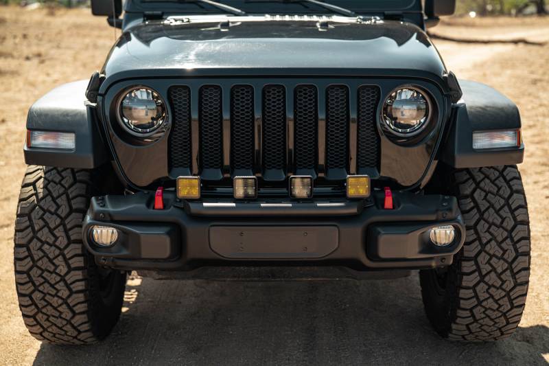 The Wrangler JL Push Bar for the Mopar Rubicon Steel Bumper is a low-profile, prerunner-style mount that adds lighting options and light grille protection. It fits up to a 20" light bar, eight 3" pods, or four 7" round lights while retaining camera visibility and license plate mount compatibility. It bolts directly to the factory steel bumper using OEM hardware and clears OEM-recommended winches.